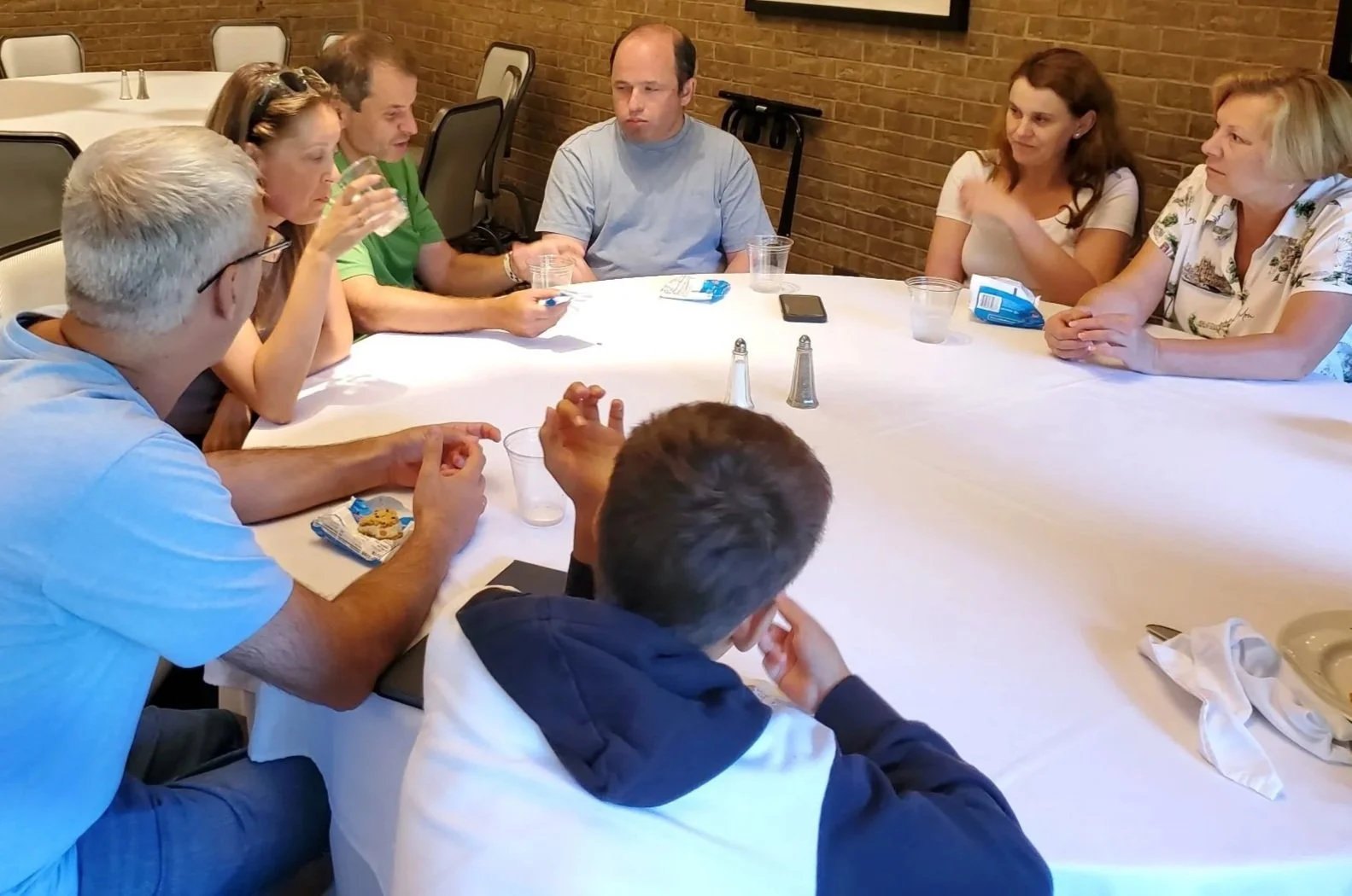 Caveman Chess Camp 2025 participants can chat with Grandmasters Avrukh and Shulman over lunch.